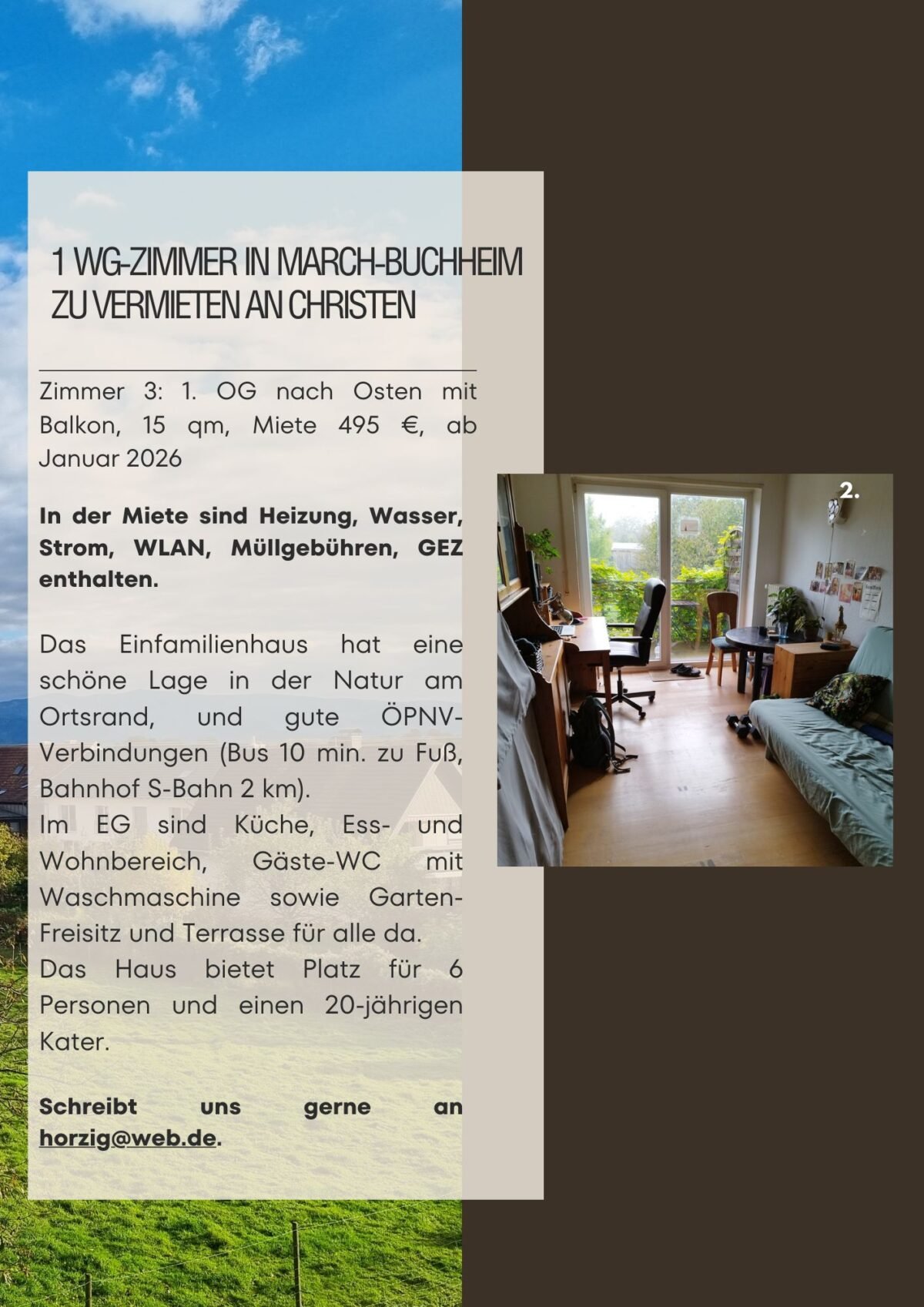 In March-Buchheim ist ab 01.01.2026 in einem schönen und naturnah gelegenen Haus ein WG-Zimmer für Menschen jeden Alters im 1. OG frei. Wir möchten gerne unseren Glauben miteinander teilen und leben.