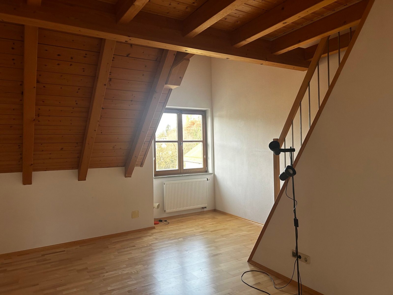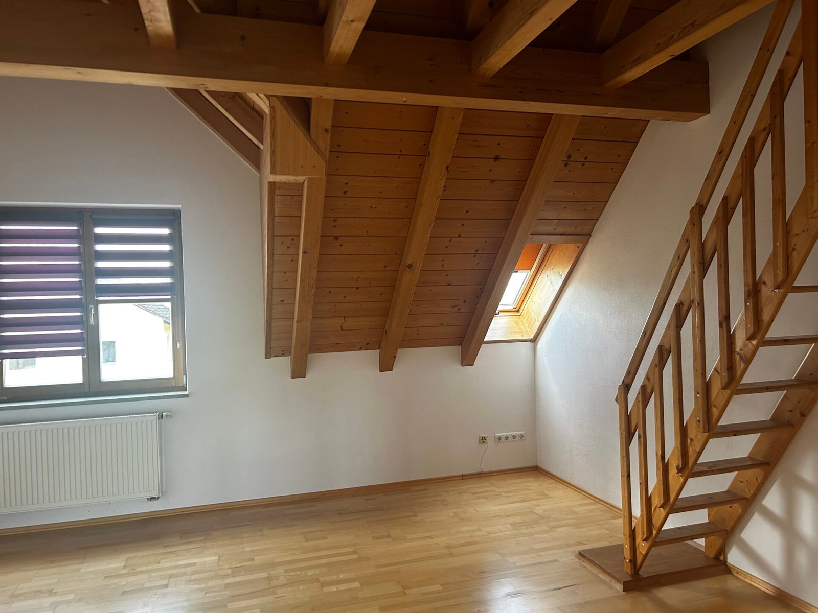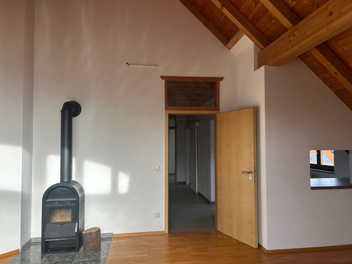 Im Dachgeschoss befinden sich drei Zimmer, jeweils mit Galerie. Eine Einbauküche ist vorhanden. Das großzügige Wohnzimmer verfügt über einen Kaminofen. Ein Stellplatz sowie ein eigenes Kellerabteil gehören ebenfalls zur Wohnung.