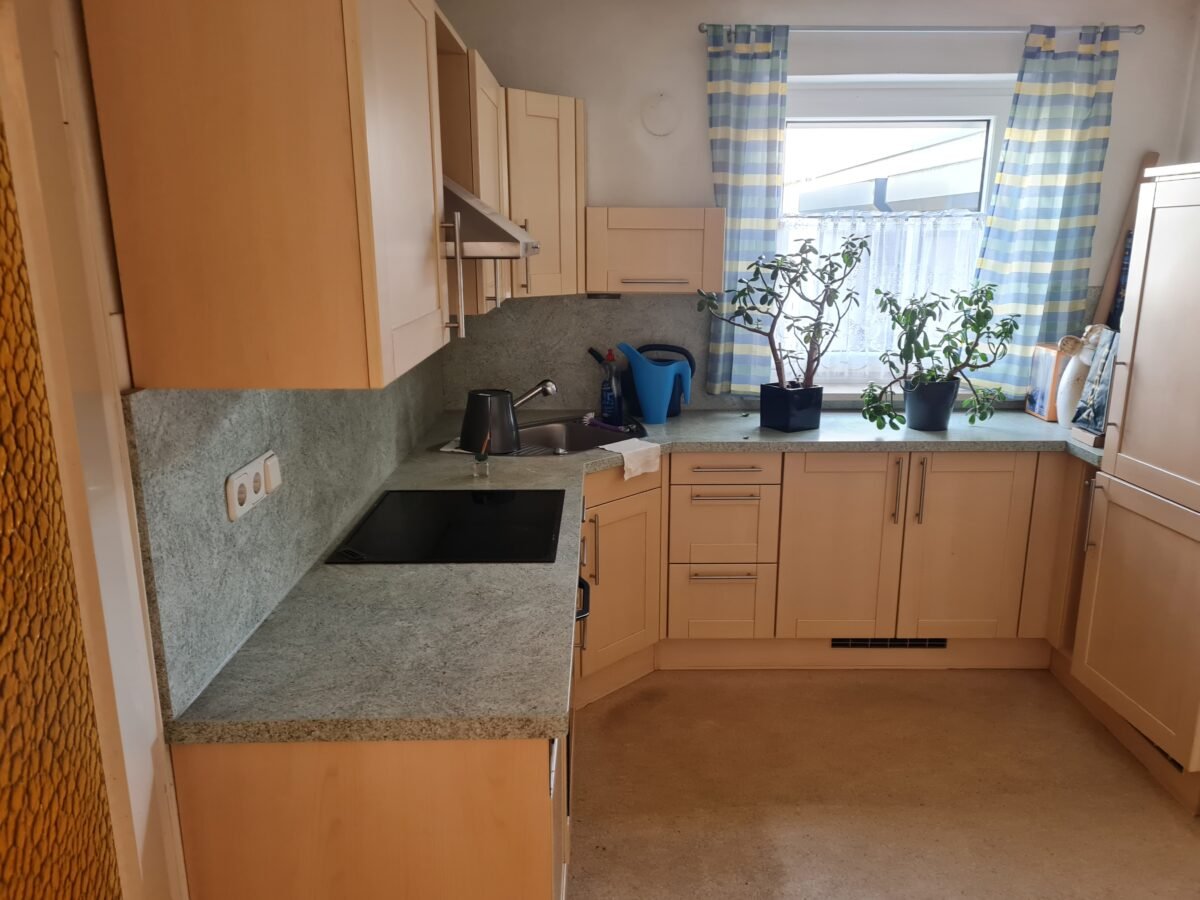 Küche: Ober- und Unterschränke mit Dunstabzugshaube, Spülmaschine, Herd mit Kochfeld und Backofen, Kühl-Gefrierkombi mit 2 Gefrierfächer