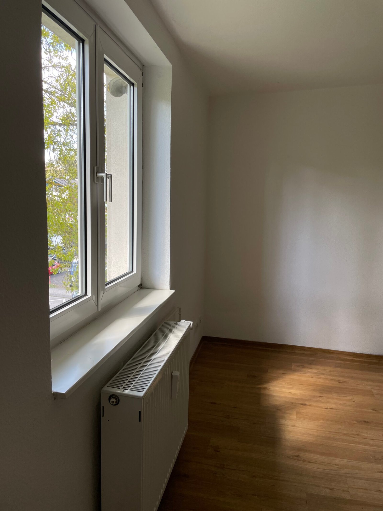 Das Zimmer ist ca. 12 m² groß. Zur Wohnung gehören außerdem eine Küche mit Essbereich sowie ein Balkon.