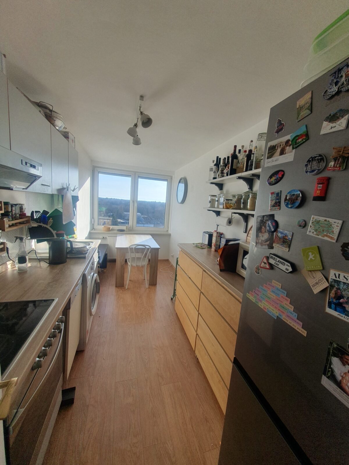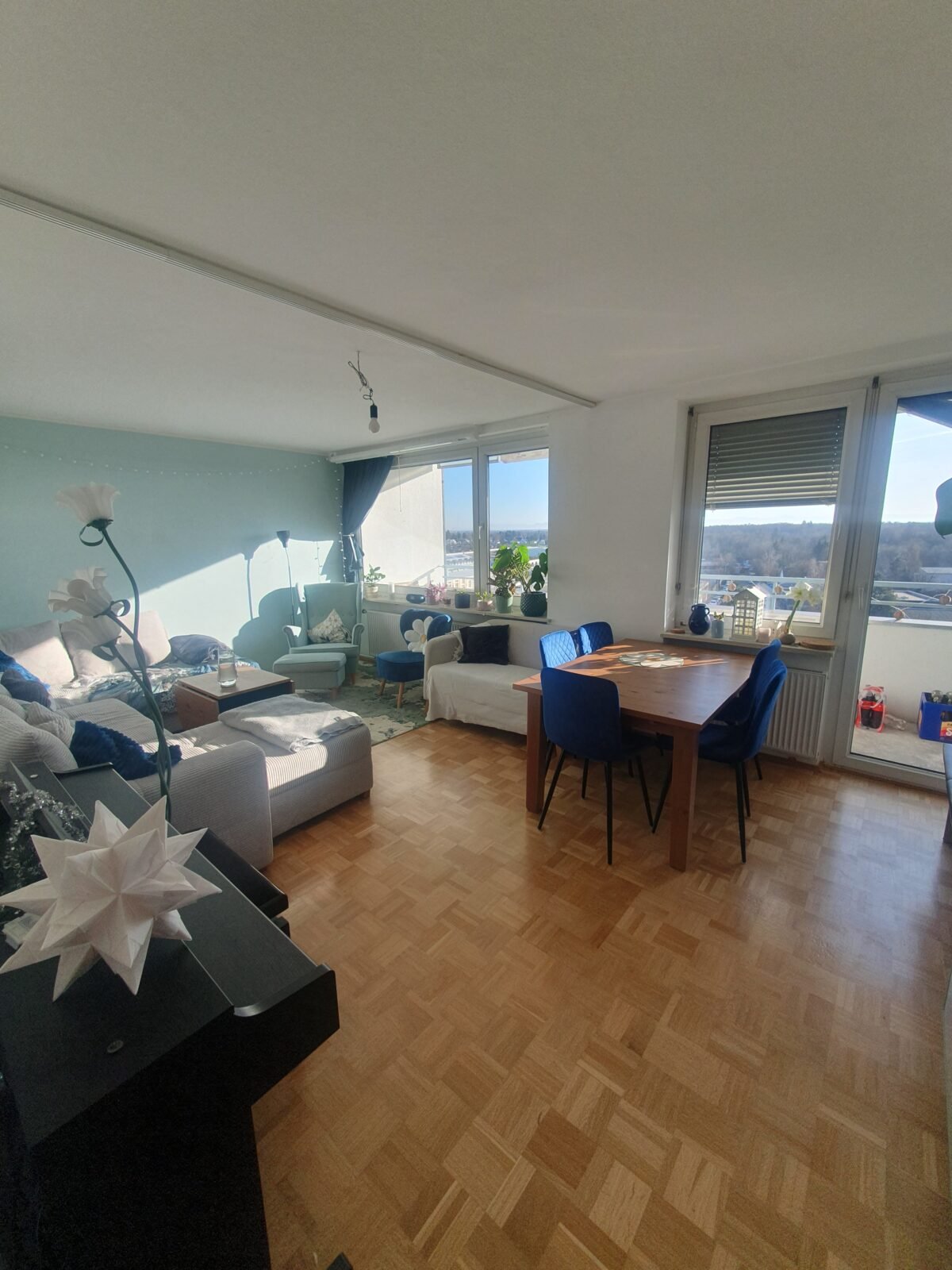 Die Wohnung befindet sich im 8. Stock (mit Aufzug) und bietet eine traumhafte Aussicht auf den Perlacher Forst und die Alpen. Es gibt eine große, voll ausgestattete Küche, ein sehr geräumiges Wohnzimmer mit viel Platz für Gäste sowie ein praktisch getrenntes Bad und WC.